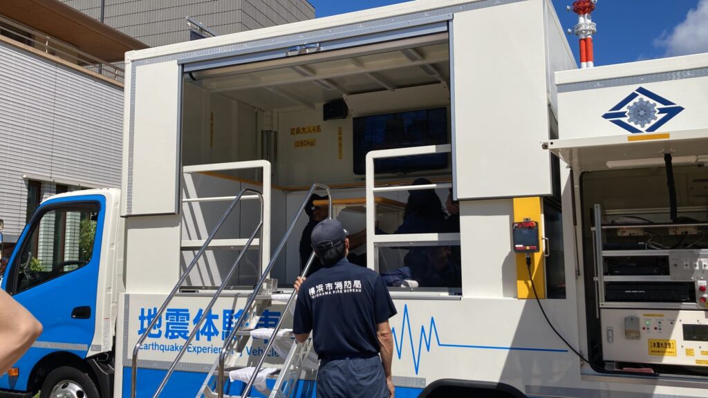 横浜市消防局による震災体験では起震車に乗って震度7の地震を体験することができました。