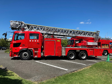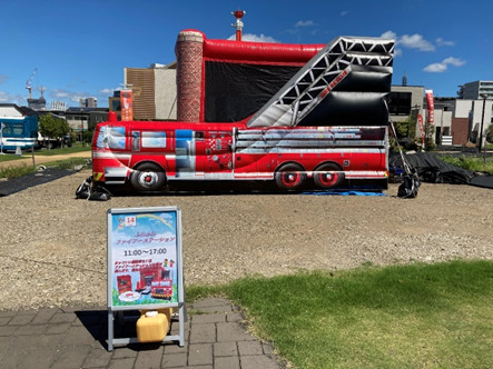 消防車は近くで見ると大迫力。送風機でふくらませた、ふわふわのファイヤーステーションの中では子どもたちが楽しそうに飛びはねて遊んでいました。