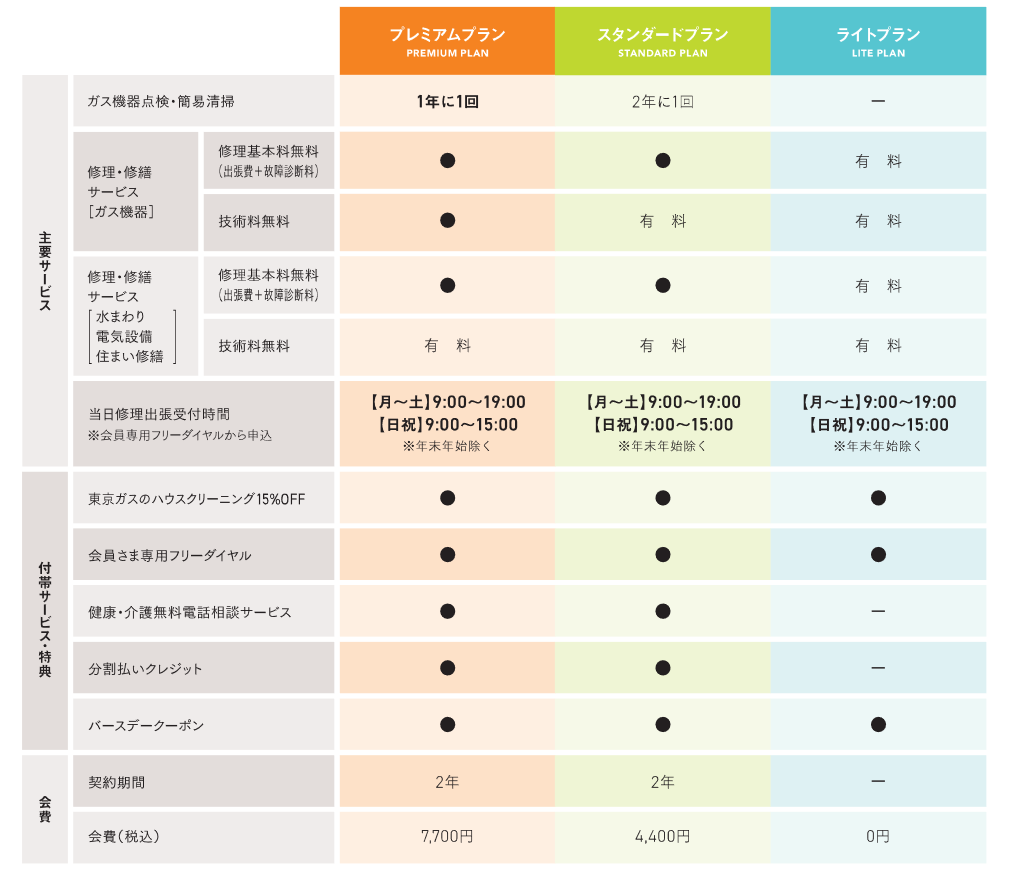 ◆プレミアムプランは修理基本料およびガス機器修理の技術料が無料となります。