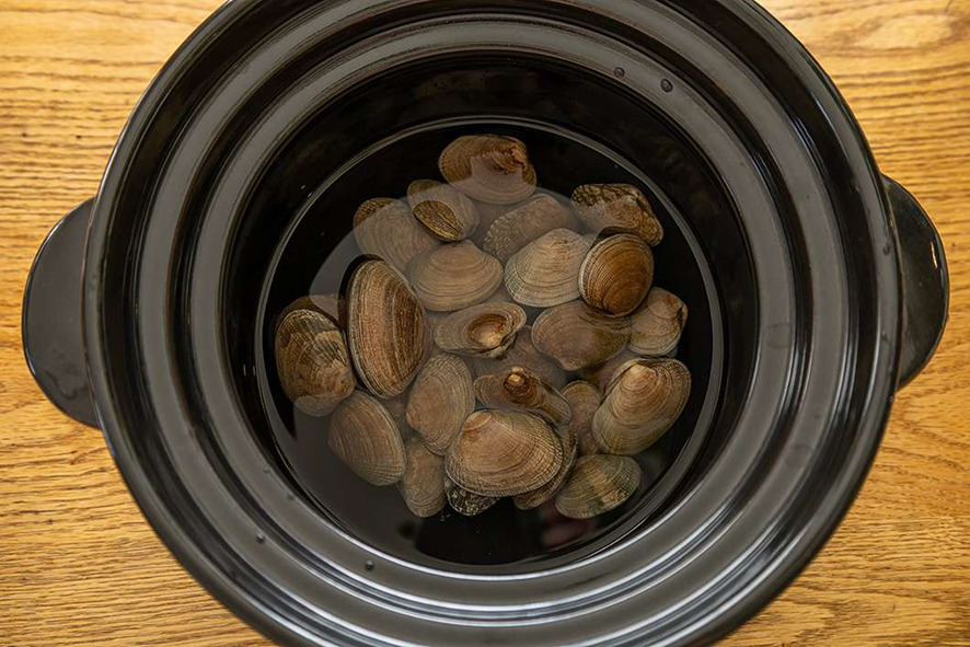 「かまどさん」にあさり・水350㎖を入れ、ふたをして(中ふたはここでは使用しません)火にかける。沸騰してあさりの口が開いたら火を止め、あさりを取り出す。残った煮汁にしょうゆ・みりんを加えて再度火にかけて沸騰させ、わかめをさっと煮る。ボウルを受けたざるに汁ごとあけて取り出す。