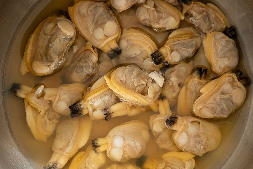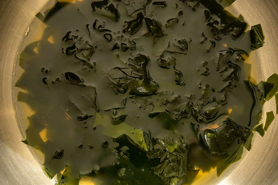 米を炊いている間に▼02のあさりを殻から外し、残った▼02の煮汁に漬けておく。わかめも同様に煮汁に漬けておく。