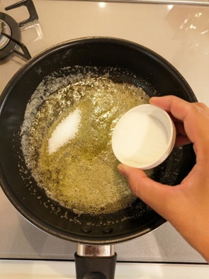 フライパンを弱火で熱し、バターを溶かし、グラニュー糖を全体に振り入れ火を止める。