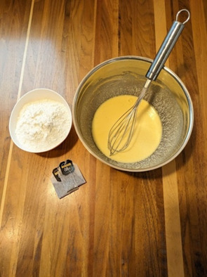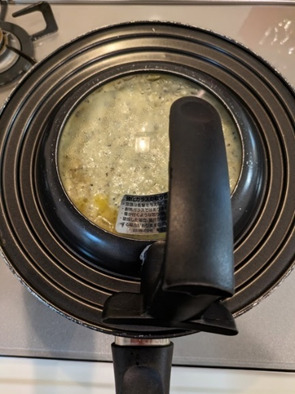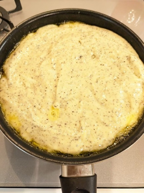 ③のフライパンに静かに流し入れる。蓋をして弱火で20分焼く。