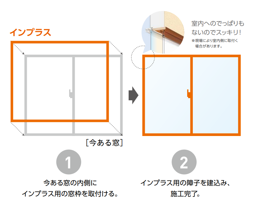 LIXIL製「インプラス」は既存の窓に内窓を取り付けるだけの簡単な工事で、1窓あたりの工事時間は約60分(※)です。