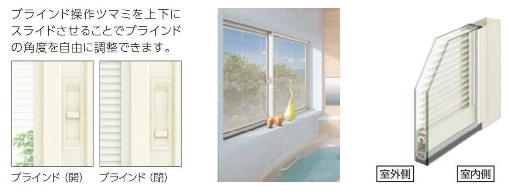 日差しの調節や目隠しとして効果的な、ブラインドを組み込んだガラスも取り揃えています。
