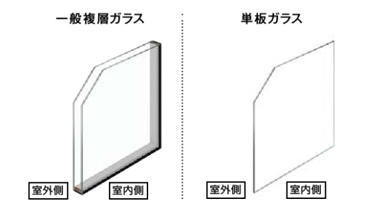 ほかに、2枚のガラスと中空層で断熱効果を高める一般複層ガラスのほか、単板ガラスもあります。