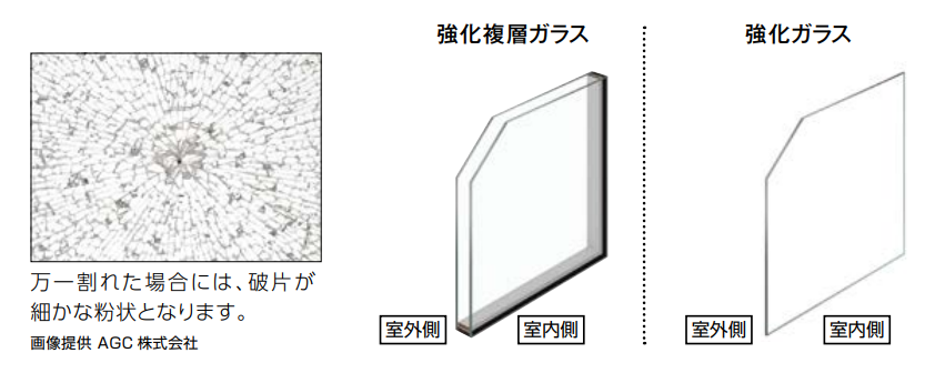 安全性を高めるなら、同じ厚さの単板ガラスと比較して約3~5倍の強度があり、割れにくいガラスもあります。