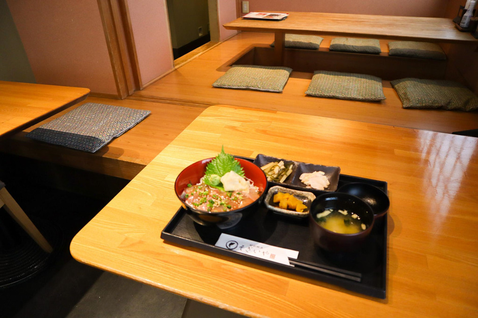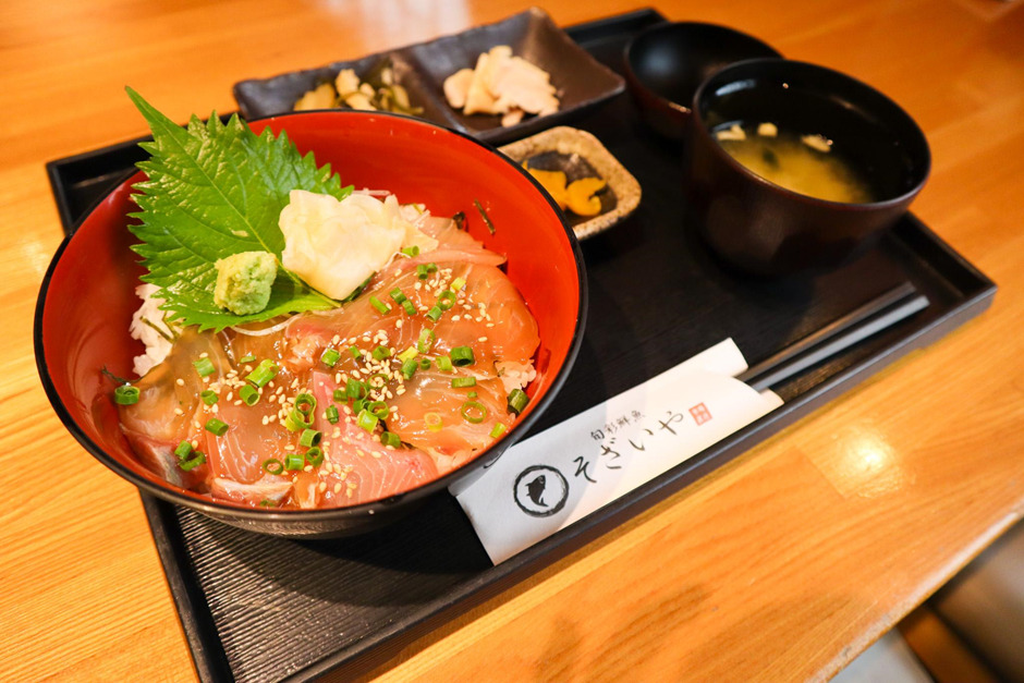 取材当日にいただいたのは、当日の仕入れ状況で変わる日替わりのおすすめメニュー、「カンパチの漬け丼」です。丼に盛られたあでやかな切り身は、新鮮さが伝わってくるほどの透明感で、その甘味は格別。2種類の小鉢(こばち)・香(こう)の物・みそ汁が添えられ、ヘルシーながらも満足感の高い一品でした。