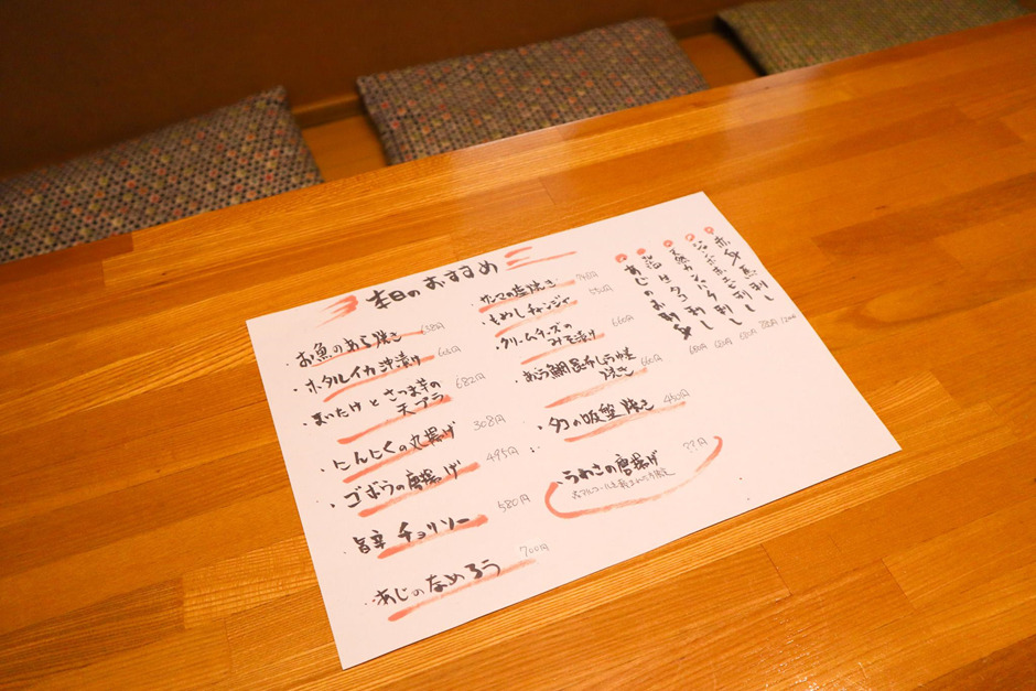 ディナータイムには刺身・焼き物などのグランドメニューに加え、「毎日自分で考えて、手作りしている」というおすすめメニューがあります。どれもおいしそうだと目を走らせていると、「うわさの唐揚げ」という気になるネーミングの料理が。「このうわさの唐揚げって……?」と聞くと、「1個単位で注文できる、鶏の唐揚げなんですけどね。こうやって書いておけば、スタッフがお客さんと会話するネタになるかなと思って(笑)」といたずらっぽい眼差しを向けられました。