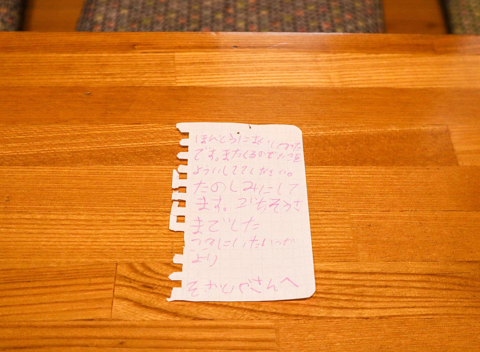 リニューアルオープンから2ヶ月が経った頃、席の片付けをしていたスタッフが、1枚のメモ書きを見つけました。それは、お客さまからの置き手紙で、「ほんとうにおいしかったです。またくるのでたこをよういしててください」とお子さまが書かれたと思われる文字が書き連ねてありました。