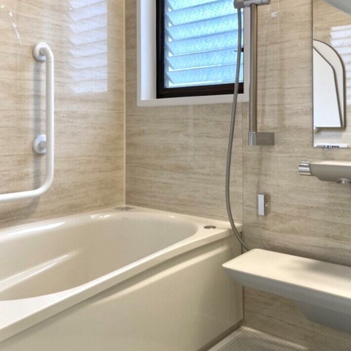 間口ギリギリまでサイズを大きくした1216サイズのユニットバスをご提案。浴槽横の壁には手すりを設置し、快適さに加えて安全なお風呂へと変身しました。