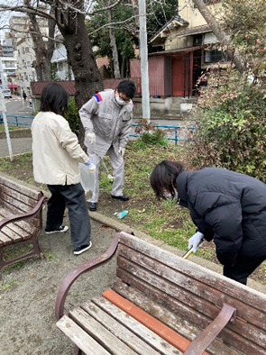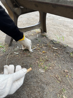 本社近くの戸部公園にて清掃している様子。ベンチの下にはたばこの吸い殻やお菓子のごみが目立ちます。