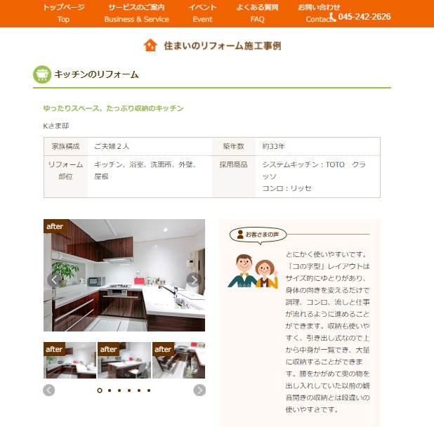 「動線がスムーズになるリフォーム」「機能充実なキッチン」「バリアフリー仕様のバスルーム」など、タイプ別にリフォーム実例をご紹介しています。