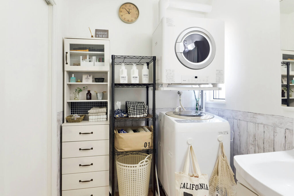 引き出しには洗濯グッズやタオルなどが、足元には脱衣かごを収納できます。