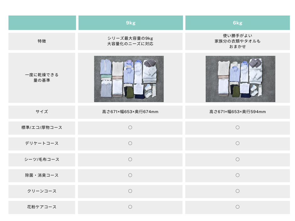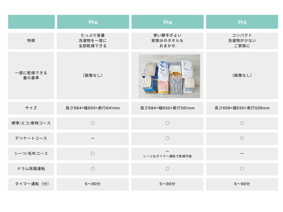 「乾太くん」のサイズは、スタンダードタイプなら3kg・5kg・8kg、デラックスタイプなら6kg・9kgから選べます。基本的には洗濯物の種類・量に応じて選ぶと良いでしょう。