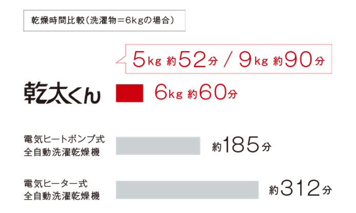 「乾太くん」は9kgの洗濯物を約90分、5kgの洗濯物を約52分で乾燥できます。(※)