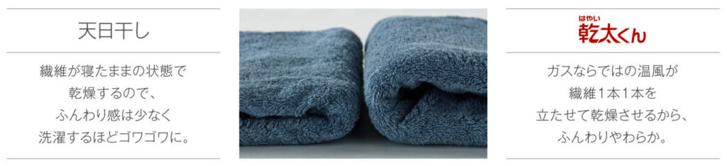 「乾太くん」は強い温風をたっぷり送り込むので、タオルの繊維が根元から立ち上がりふんわりした仕上がりに。天日干しでは繊維が寝たままの状態で乾燥するので、ふんわり感が少なくなりがちです。