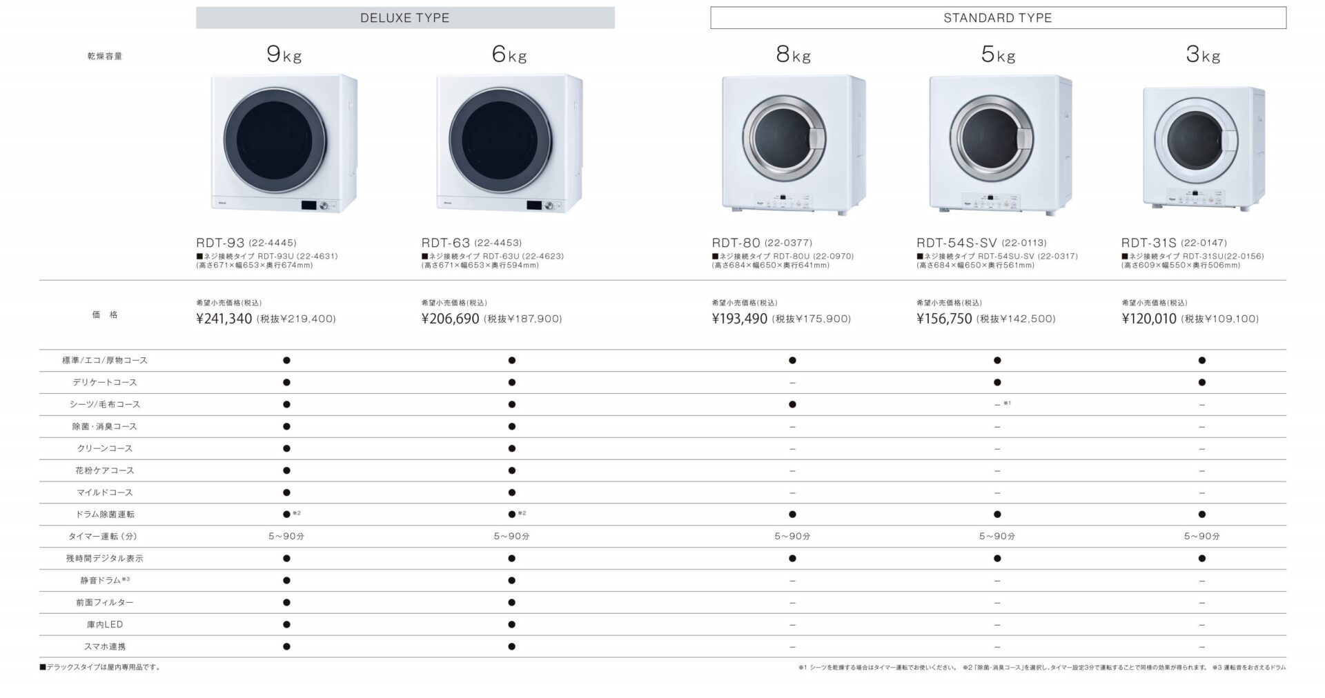 スタンダードタイプは乾燥容量3kg・5kg・8kgの3種類、デラックスタイプは6kg・9kgの2種類です。