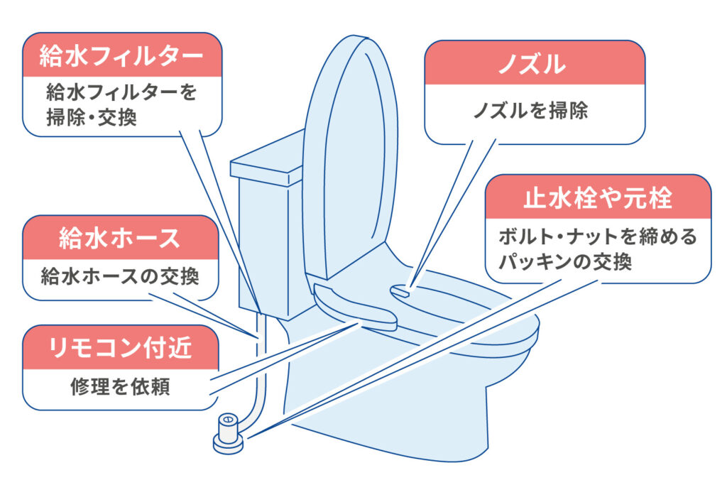 洗浄ノズル・給水フィルター(ゴミなどの混入を防ぐ部品)・給水ホースは、部品が入手できればご自身で交換できます。リモコンや操作パネルはメーカーでないと修理ができませんので、ご注意ください。
