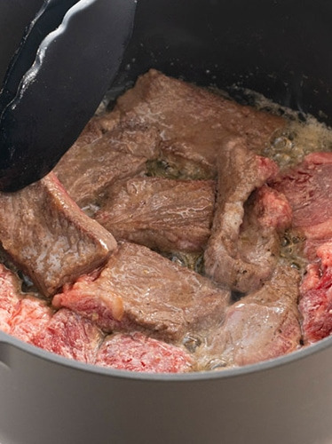 鍋にバターを入れて中火で熱し、1.の牛肉を両面焼き色がつくまで焼く。牛肉を取り出し、2.の玉ねぎ、にんじん、マッシュルームの順に入れ、牛肉を戻す。よく混ぜ合わせたaをさらに加える。