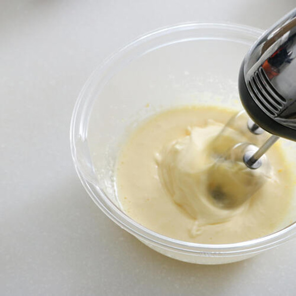 卵をボウルに割り入れ、ハンドミキサーで泡立てる。砂糖を3-4回に分けながら加え、白くとろんとするまで混ぜる。