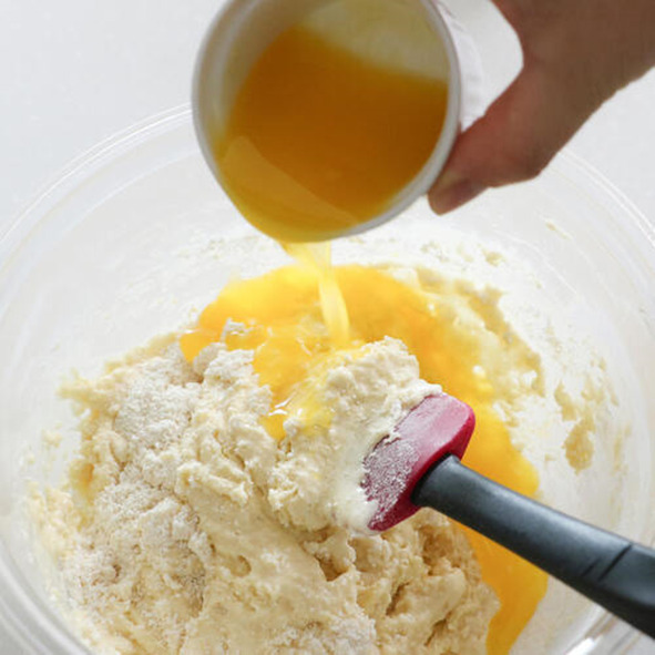 ふるっておいた粉類を一度に加え、ヘラで切るように混ぜる。