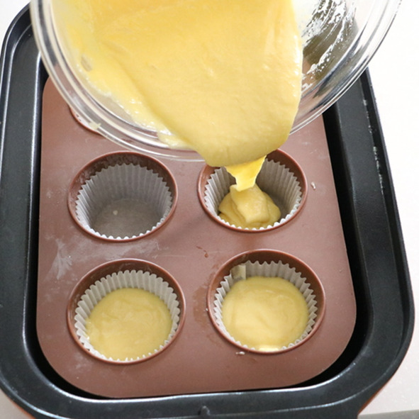 牛乳も加えて混ぜ、なめらかになったらカップケーキ型に流し入れる。7分目まで注ぐ。残った分は別の型に入れておき、後で焼く。