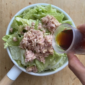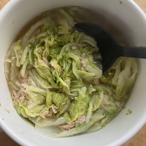 鍋に白菜の芯、葉、ツナ缶(汁ごと)麺つゆの順に入れて蓋をする。