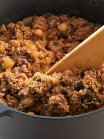 鍋にオリーブオイルをひき、にんにく、しょうが、玉ねぎ、1.のなす、レーズン、ひよこ豆の順に入れ、上に2.を広げる。蓋をして、中火で2分加熱し、その後トロ火で60分[22cm] / 35分[18cm]煮る。