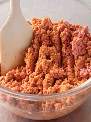 ボウルに合い挽き肉とaを入れ、肉にねばりが出ないようにゴムベラで切るように混ぜる。
