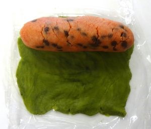 いちごパウダーを加えた生地は円柱型にまとめます。