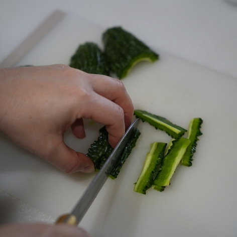 ゴーヤは縦半分に切り、種とワタを取り除く。4等分の長さに切ったら3㎜の細切りにする。
