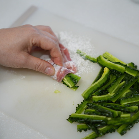 豚バラ薄切り肉に薄力粉を薄くはたき、ゴーヤを1/8乗せたら端から巻く。同様に8個作る。