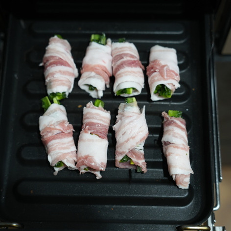 マルチグリル専用容器の波型プレートパンに、②の巻き終わりが下になるように並べる。調理モード[焼く・中火]で10分加熱する。