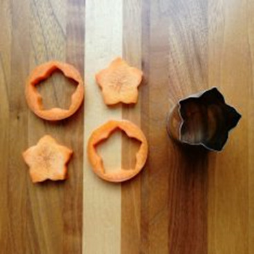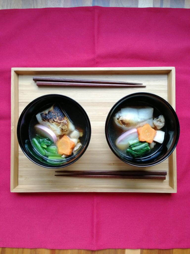 お椀に、焼いた餅・かまぼこ・人参・小松菜を並べ、④の汁をゆっくり注ぐ。