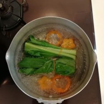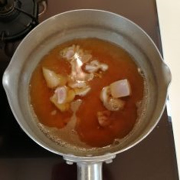 ②のだし汁に、調味料を入れ1分以上沸騰させる。火を止めて鶏肉を入れ、再び火にかけるが、沸騰しないように注意して鶏肉に火を通す。
