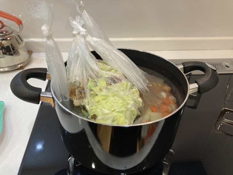 停電や断水などで調理が難しい状況でも、ガスが供給されている場合、コンロとポリ袋を使えば少ない水と道具で調理をすることができます。食べた後はそのまま捨てられるのもポイント。