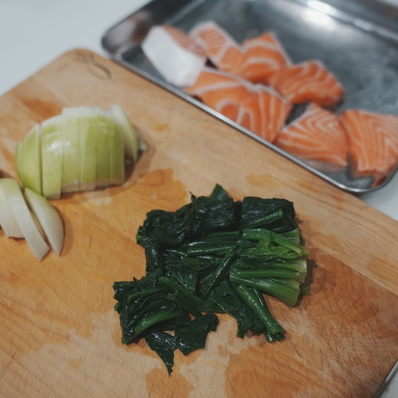 木べらで全体を混ぜ、とろみがついてきたら生鮭を加える。鮭に火が通ったらほうれん草を加え、器に盛る。