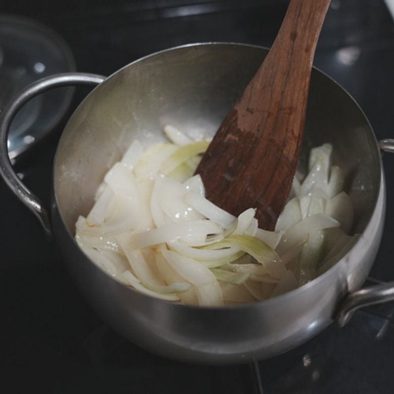 鍋にバターを入れて弱火で熱する。バターが溶けたら玉ねぎを入れ、透き通るまで炒める。