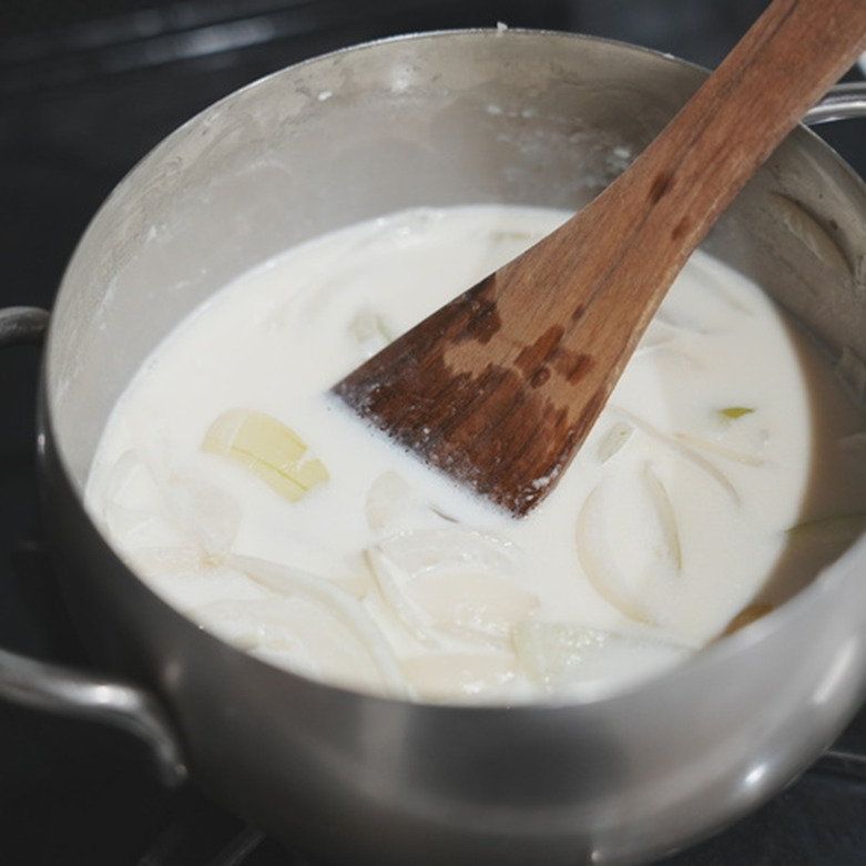 米粉を加えて炒め、全体に米粉が均一に回ったら牛乳と塩を加えて中火で熱する。