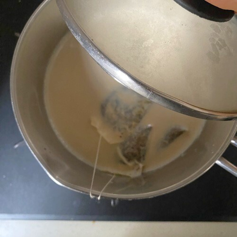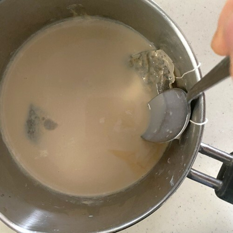 鍋に牛乳と紅茶のティーバックを入れて沸騰直前まで温める。 蓋をして5分程置いておく。