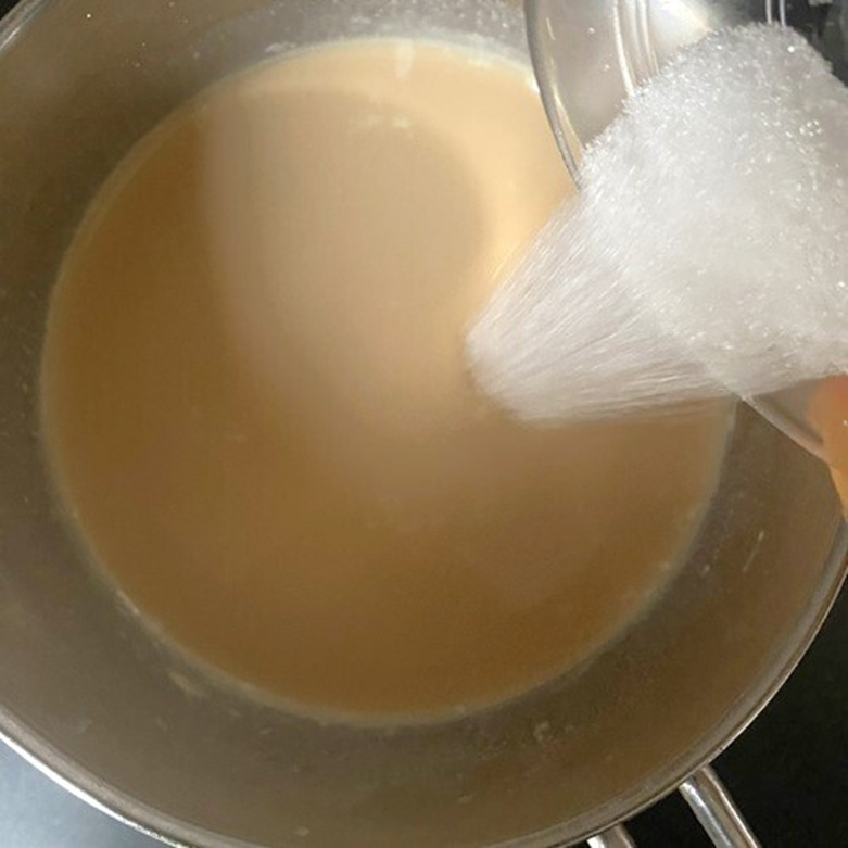 ▼03に下準備したゼラチンとグラニュー糖を加えて弱火にかける。