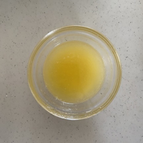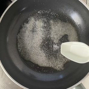 フライパンにキャラメル用バターを入れて点火し、バターが溶けたら全体に広げ、キャラメル用のグラニュー糖を振り入れて消火する。