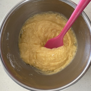 ▼02に溶きほぐした卵と牛乳を入れてよく混ぜたら、薄力粉とベーキングパウダーを合わせてふるい入れ、ゴムベラでさっくりと混ぜ合わせる。