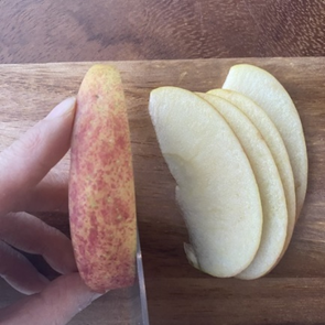 りんごは種と芯を取り除き、5㎜幅のスライスにする。