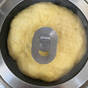 りんごを放射状に並べたら、その上に▼03を流し入れ、点火をしモードキー押して温度表示を設定する。蓋をして、130~135℃で温度をキープし12~14分加熱する。
