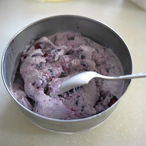 生クリーム、冷凍ブルーベリーも加えて軽くブルーベリーをつぶすように混ぜ、フタ付き容器に移し替えて冷凍庫で冷やす。
