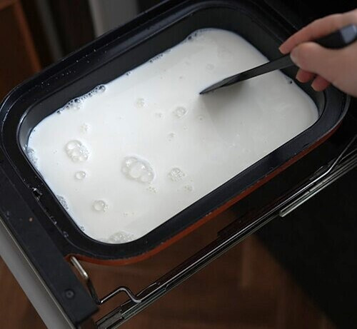マルチグリルのキャセロールに牛乳と砂糖を入れてよく混ぜ、フタをして調理モード[煮る]で30分加熱する。
