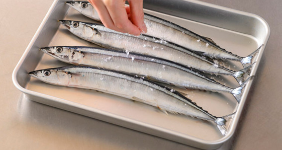 さんまは洗って水気を拭き、両面にしっかりと塩をふる。
