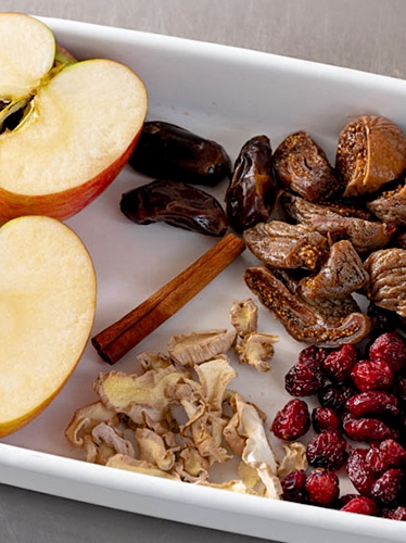 りんご、いちじくは半分に切る。ドライフルーツにオイルコーティングがある場合は湯通しをしてザルにあげる。